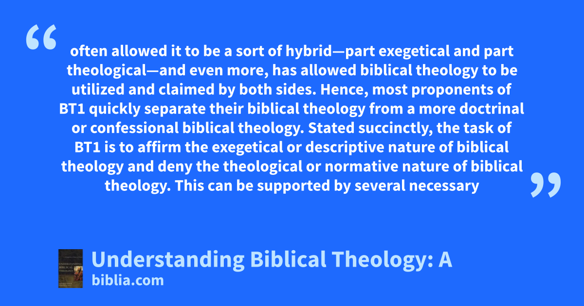 often allowed it to be a sort of hybrid—part exegetical and part theological—and even more, has allowed biblical theology to be utilized and claimed by both sides. Hence, most proponents of BT1 quickly separate their biblical theology from a more doctrinal or confessional biblical theology. Stated succinctly, the task of BT1 is to affirm the exegetical or descriptive nature of biblical theology and deny the theological or normative nature of biblical theology. This can be supported by several necessary