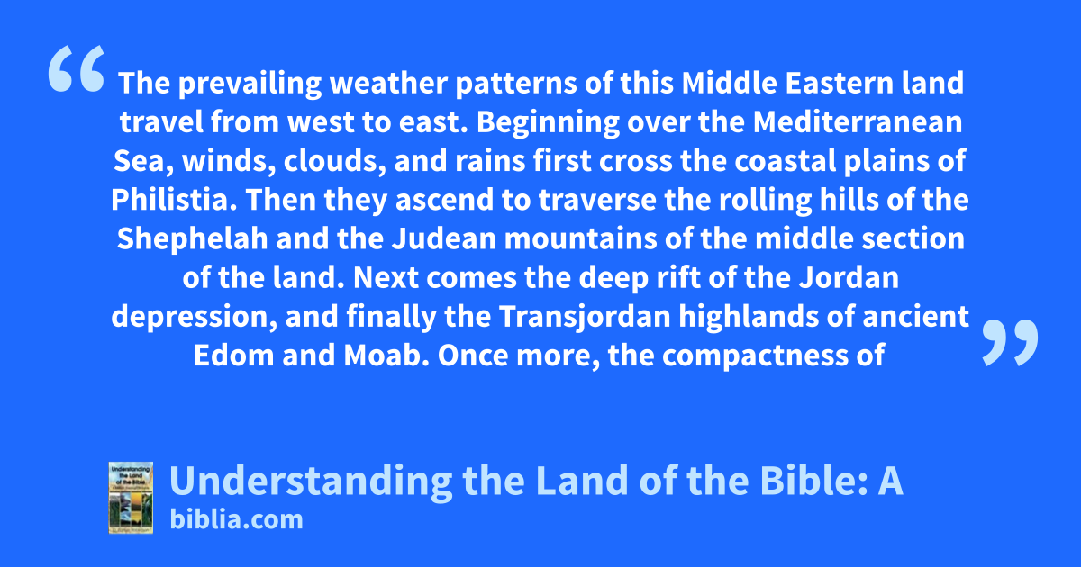 The prevailing weather patterns of this Middle Eastern land travel from west to east. Beginning over the Mediterranean Sea, winds, clouds, and rains first cross the coastal plains of Philistia. Then they ascend to traverse the rolling hills of the Shephelah and the Judean mountains of the middle section of the land. Next comes the deep rift of the Jordan depression, and finally the Transjordan highlands of ancient Edom and Moab. Once more, the compactness of