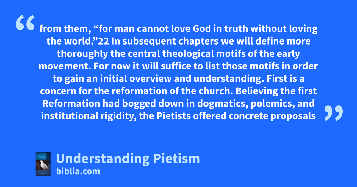 from them, “for man cannot love God in truth without loving the world.”22 In subsequent chapters we will define more thoroughly the central theological motifs of the early movement. For now it will suffice to list those motifs in order to gain an initial overview and understanding. First is a concern for the reformation of the church. Believing the first Reformation had bogged down in dogmatics, polemics, and institutional rigidity, the Pietists offered concrete proposals
