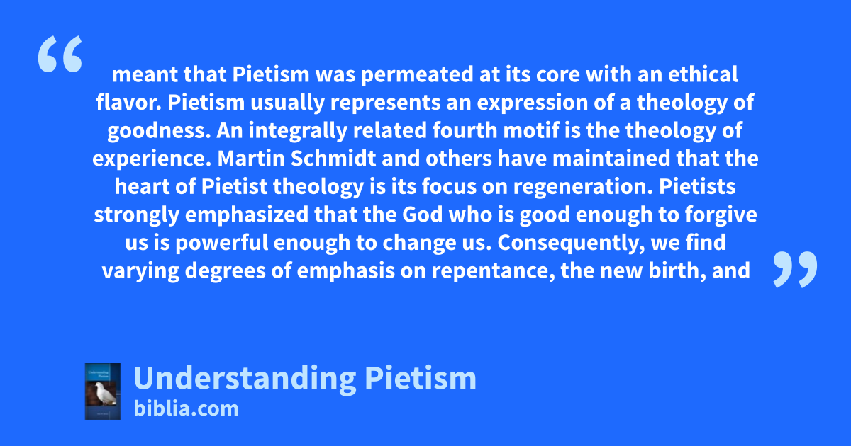 meant that Pietism was permeated at its core with an ethical flavor. Pietism usually represents an expression of a theology of goodness. An integrally related fourth motif is the theology of experience. Martin Schmidt and others have maintained that the heart of Pietist theology is its focus on regeneration. Pietists strongly emphasized that the God who is good enough to forgive us is powerful enough to change us. Consequently, we find varying degrees of emphasis on repentance, the new birth, and