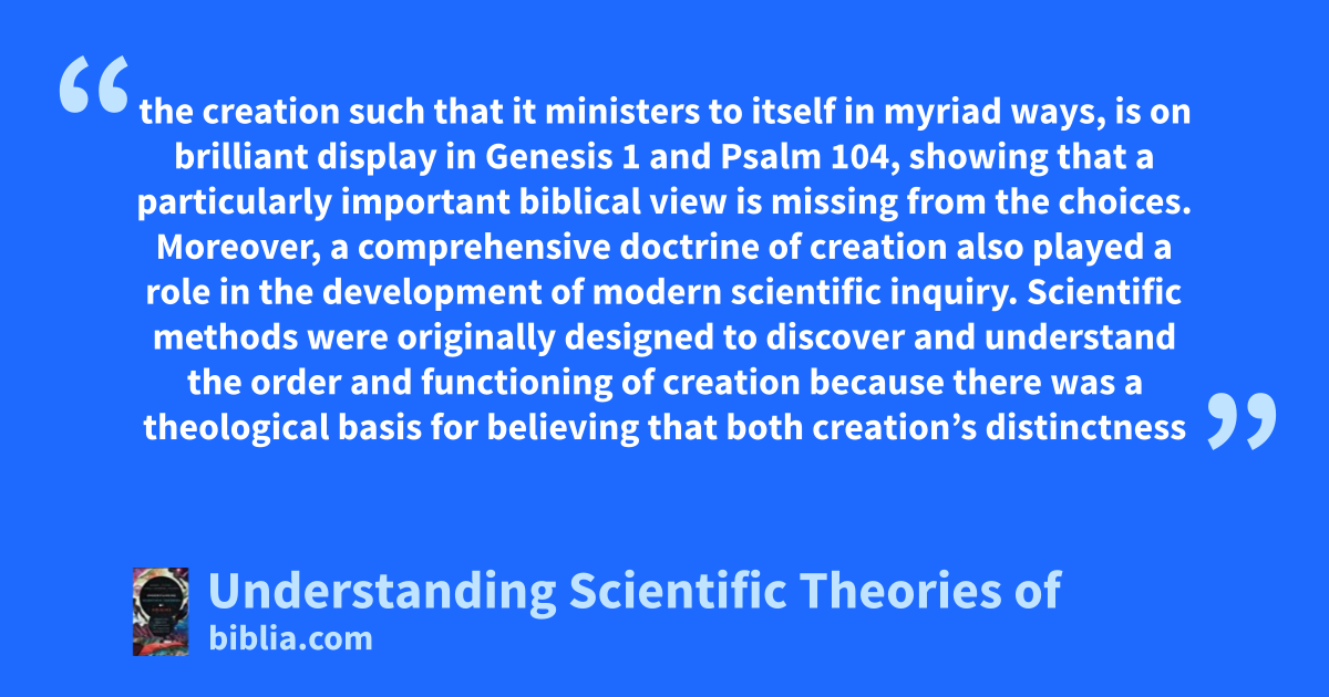 the creation such that it ministers to itself in myriad ways, is on brilliant display in Genesis 1 and Psalm 104, showing that a particularly important biblical view is missing from the choices. Moreover, a comprehensive doctrine of creation also played a role in the development of modern scientific inquiry. Scientific methods were originally designed to discover and understand the order and functioning of creation because there was a theological basis for believing that both creation’s distinctness
