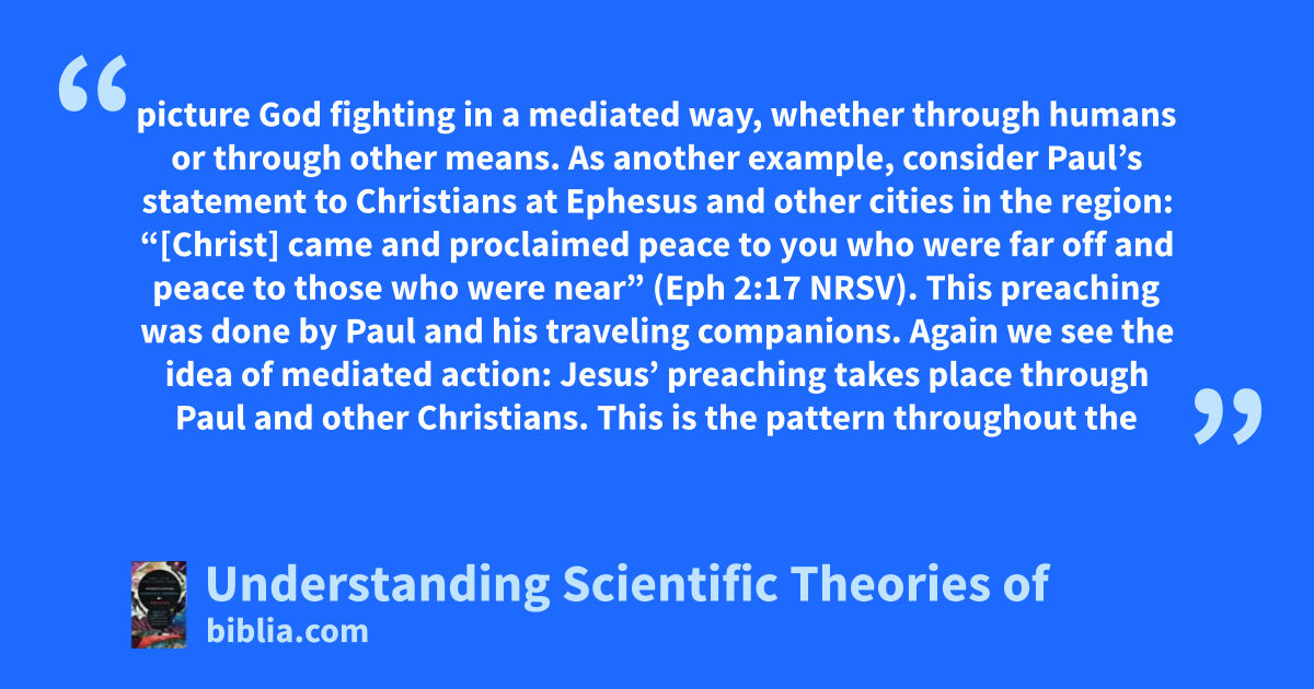 picture God fighting in a mediated way, whether through humans or through other means. As another example, consider Paul’s statement to Christians at Ephesus and other cities in the region: “[Christ] came and proclaimed peace to you who were far off and peace to those who were near” (Eph 2:17 NRSV). This preaching was done by Paul and his traveling companions. Again we see the idea of mediated action: Jesus’ preaching takes place through Paul and other Christians. This is the pattern throughout the
