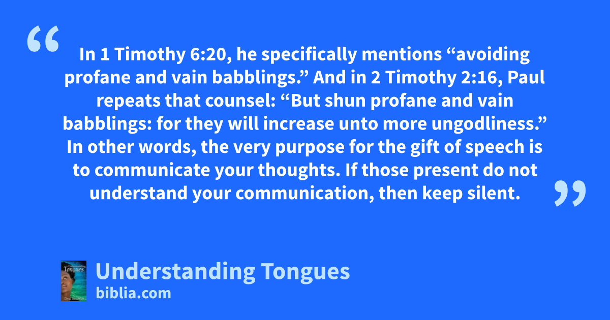 In 1 Timothy 6:20, he specifically mentions “avoiding profane and vain babblings.” And in 2 Timothy 2:16, Paul repeats that counsel: “But shun profane and vain babblings: for they will increase unto more ungodliness.” In other words, the very purpose for the gift of speech is to communicate your thoughts. If those present do not understand your communication, then keep silent.