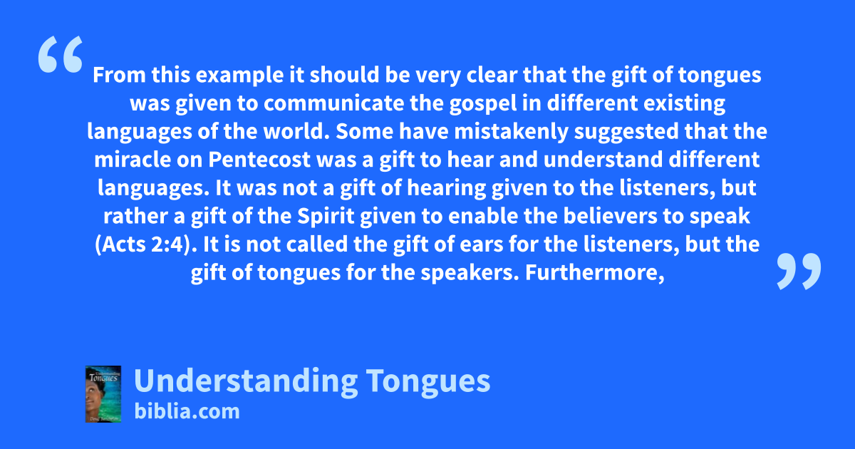 From this example it should be very clear that the gift of tongues was given to communicate the gospel in different existing languages of the world. Some have mistakenly suggested that the miracle on Pentecost was a gift to hear and understand different languages. It was not a gift of hearing given to the listeners, but rather a gift of the Spirit given to enable the believers to speak (Acts 2:4). It is not called the gift of ears for the listeners, but the gift of tongues for the speakers. Furthermore,