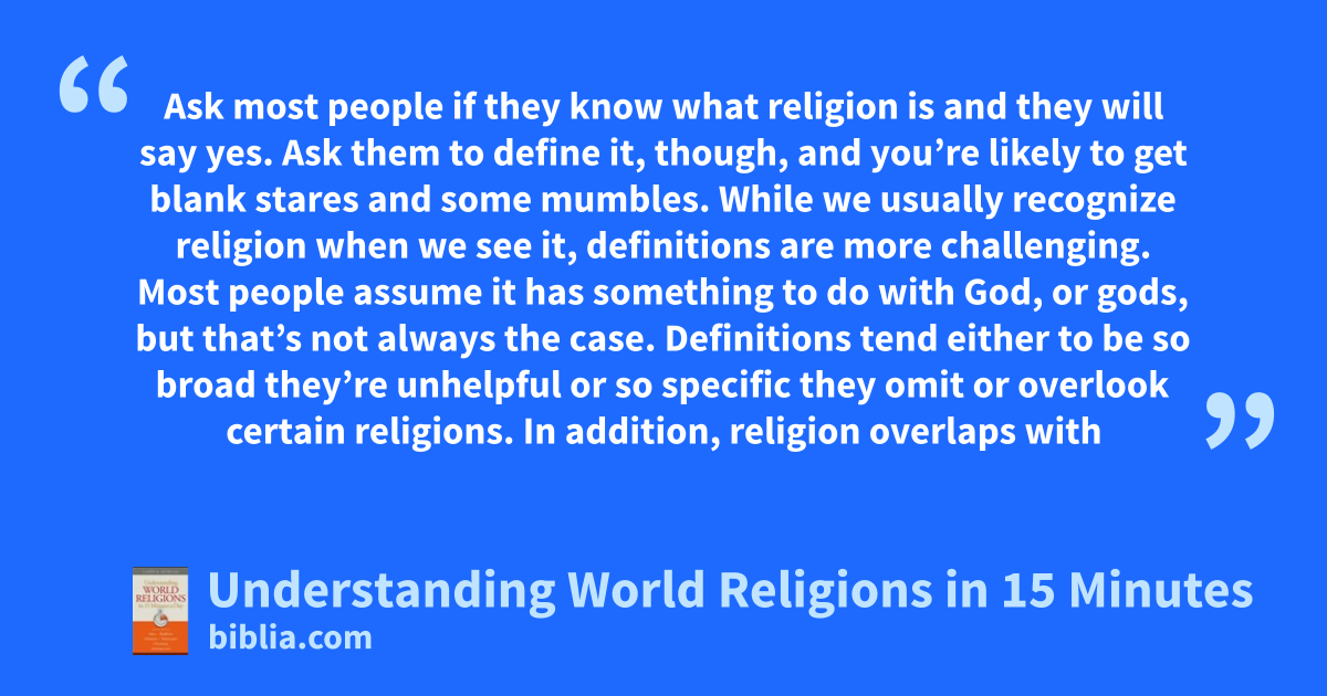 Ask most people if they know what religion is and they will say yes. Ask them to define it, though, and you’re likely to get blank stares and some mumbles. While we usually recognize religion when we see it, definitions are more challenging. Most people assume it has something to do with God, or gods, but that’s not always the case. Definitions tend either to be so broad they’re unhelpful or so specific they omit or overlook certain religions. In addition, religion overlaps with