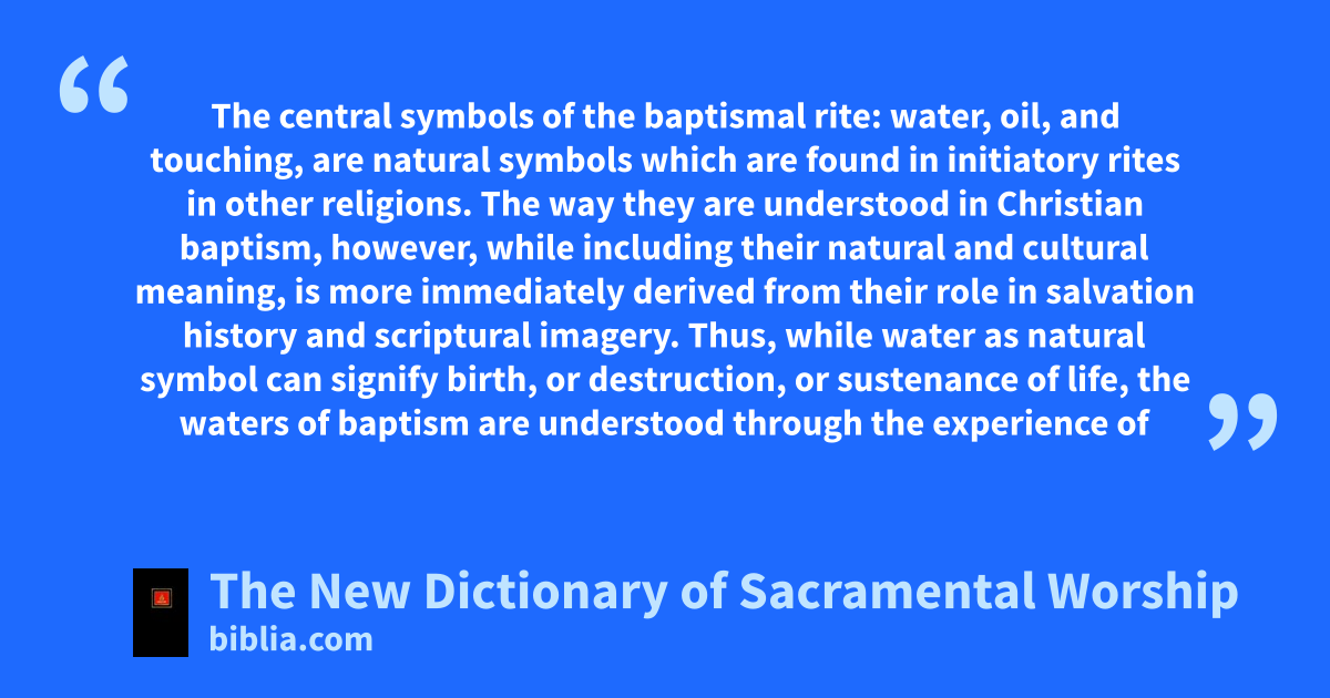 The central symbols of the baptismal rite: water, oil, and touching, are natural symbols which are found in initiatory rites in other religions. The way they are understood in Christian baptism, however, while including their natural and cultural meaning, is more immediately derived from their role in salvation history and scriptural imagery. Thus, while water as natural symbol can signify birth, or destruction, or sustenance of life, the waters of baptism are understood through the experience of