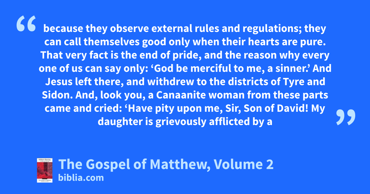 because they observe external rules and regulations; they can call themselves good only when their hearts are pure. That very fact is the end of pride, and the reason why every one of us can say only: ‘God be merciful to me, a sinner.’ And Jesus left there, and withdrew to the districts of Tyre and Sidon. And, look you, a Canaanite woman from these parts came and cried: ‘Have pity upon me, Sir, Son of David! My daughter is grievously afflicted by a