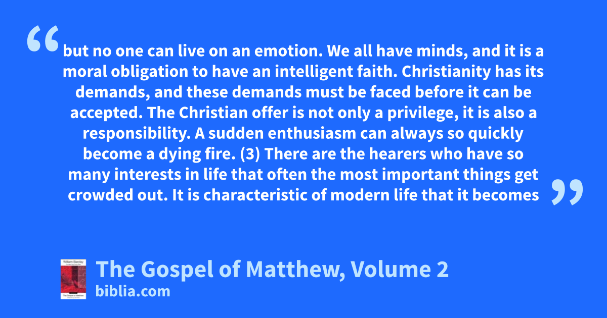 but no one can live on an emotion. We all have minds, and it is a moral obligation to have an intelligent faith. Christianity has its demands, and these demands must be faced before it can be accepted. The Christian offer is not only a privilege, it is also a responsibility. A sudden enthusiasm can always so quickly become a dying fire. (3) There are the hearers who have so many interests in life that often the most important things get crowded out. It is characteristic of modern life that it becomes