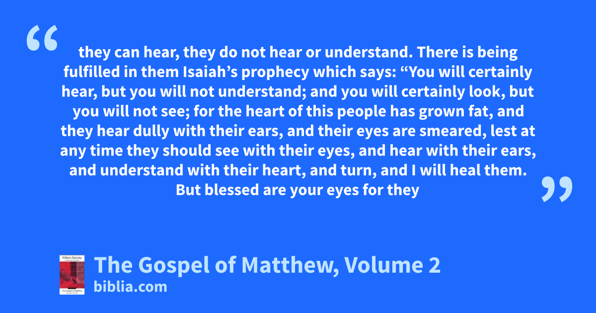 they can hear, they do not hear or understand. There is being fulfilled in them Isaiah’s prophecy which says: “You will certainly hear, but you will not understand; and you will certainly look, but you will not see; for the heart of this people has grown fat, and they hear dully with their ears, and their eyes are smeared, lest at any time they should see with their eyes, and hear with their ears, and understand with their heart, and turn, and I will heal them. But blessed are your eyes for they