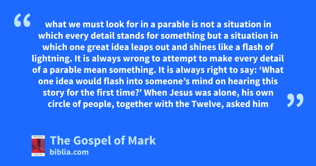 what we must look for in a parable is not a situation in which every detail stands for something but a situation in which one great idea leaps out and shines like a flash of lightning. It is always wrong to attempt to make every detail of a parable mean something. It is always right to say: ‘What one idea would flash into someone’s mind on hearing this story for the first time?’ When Jesus was alone, his own circle of people, together with the Twelve, asked him