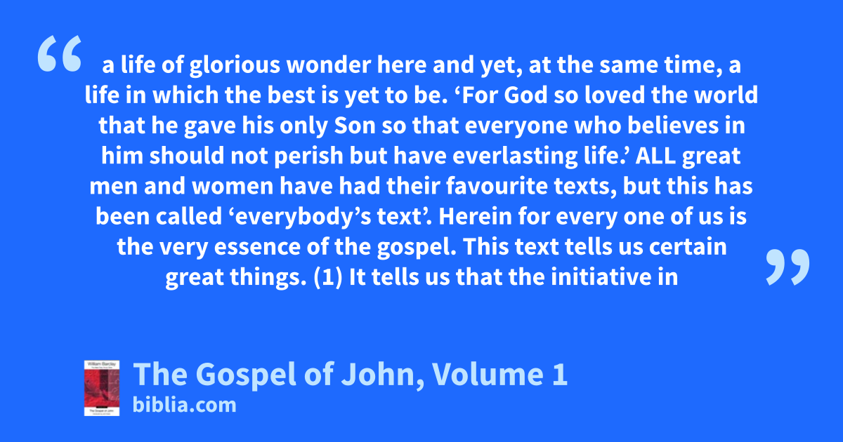 a life of glorious wonder here and yet, at the same time, a life in which the best is yet to be. ‘For God so loved the world that he gave his only Son so that everyone who believes in him should not perish but have everlasting life.’ ALL great men and women have had their favourite texts, but this has been called ‘everybody’s text’. Herein for every one of us is the very essence of the gospel. This text tells us certain great things. (1) It tells us that the initiative in