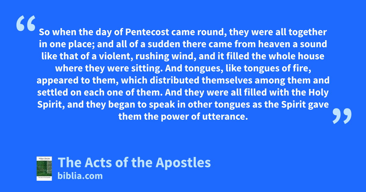 So when the day of Pentecost came round, they were all together in one place; and all of a sudden there came from heaven a sound like that of a violent, rushing wind, and it filled the whole house where they were sitting. And tongues, like tongues of fire, appeared to them, which distributed themselves among them and settled on each one of them. And they were all filled with the Holy Spirit, and they began to speak in other tongues as the Spirit gave them the power of utterance.