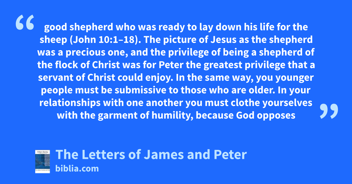 good shepherd who was ready to lay down his life for the sheep (John 10:1–18). The picture of Jesus as the shepherd was a precious one, and the privilege of being a shepherd of the flock of Christ was for Peter the greatest privilege that a servant of Christ could enjoy. In the same way, you younger people must be submissive to those who are older. In your relationships with one another you must clothe yourselves with the garment of humility, because God opposes
