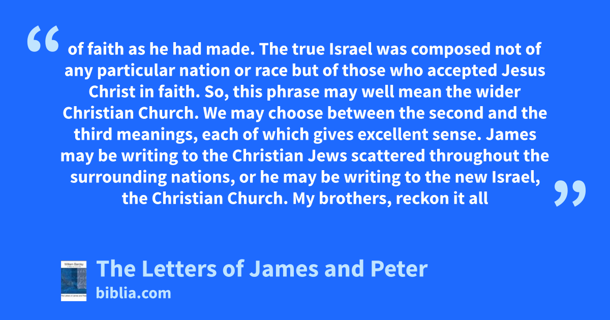 of faith as he had made. The true Israel was composed not of any particular nation or race but of those who accepted Jesus Christ in faith. So, this phrase may well mean the wider Christian Church. We may choose between the second and the third meanings, each of which gives excellent sense. James may be writing to the Christian Jews scattered throughout the surrounding nations, or he may be writing to the new Israel, the Christian Church. My brothers, reckon it all
