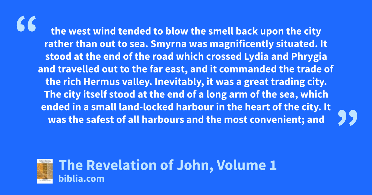 the west wind tended to blow the smell back upon the city rather than out to sea. Smyrna was magnificently situated. It stood at the end of the road which crossed Lydia and Phrygia and travelled out to the far east, and it commanded the trade of the rich Hermus valley. Inevitably, it was a great trading city. The city itself stood at the end of a long arm of the sea, which ended in a small land-locked harbour in the heart of the city. It was the safest of all harbours and the most convenient; and