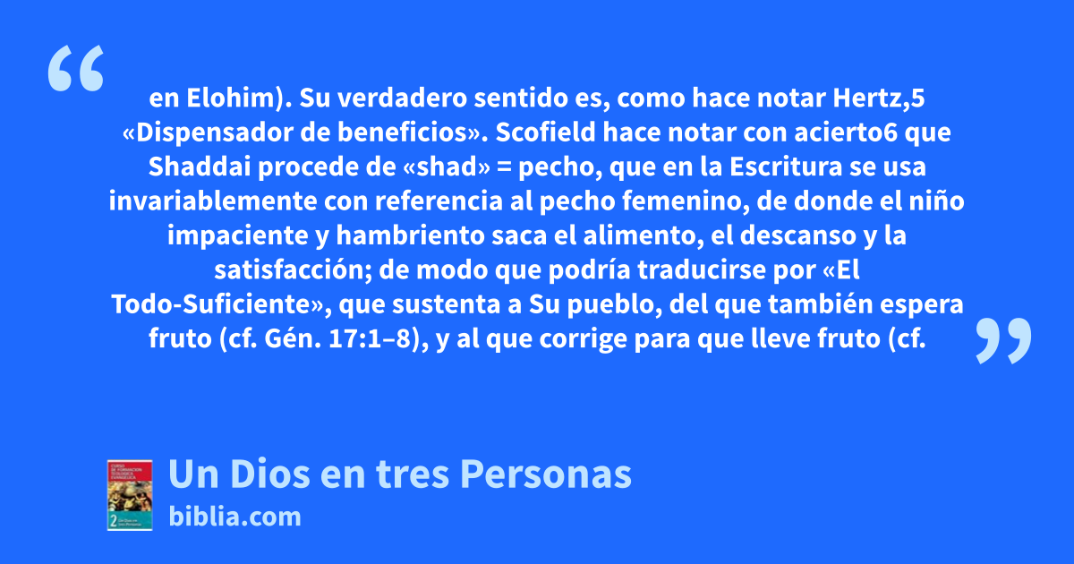 en Elohim). Su verdadero sentido es, como hace notar Hertz,5 «Dispensador de beneficios». Scofield hace notar con acierto6 que Shaddai procede de «shad» = pecho, que en la Escritura se usa invariablemente con referencia al pecho femenino, de donde el niño impaciente y hambriento saca el alimento, el descanso y la satisfacción; de modo que podría traducirse por «El Todo-Suficiente», que sustenta a Su pueblo, del que también espera fruto (cf. Gén. 17:1–8), y al que corrige para que lleve fruto (cf.