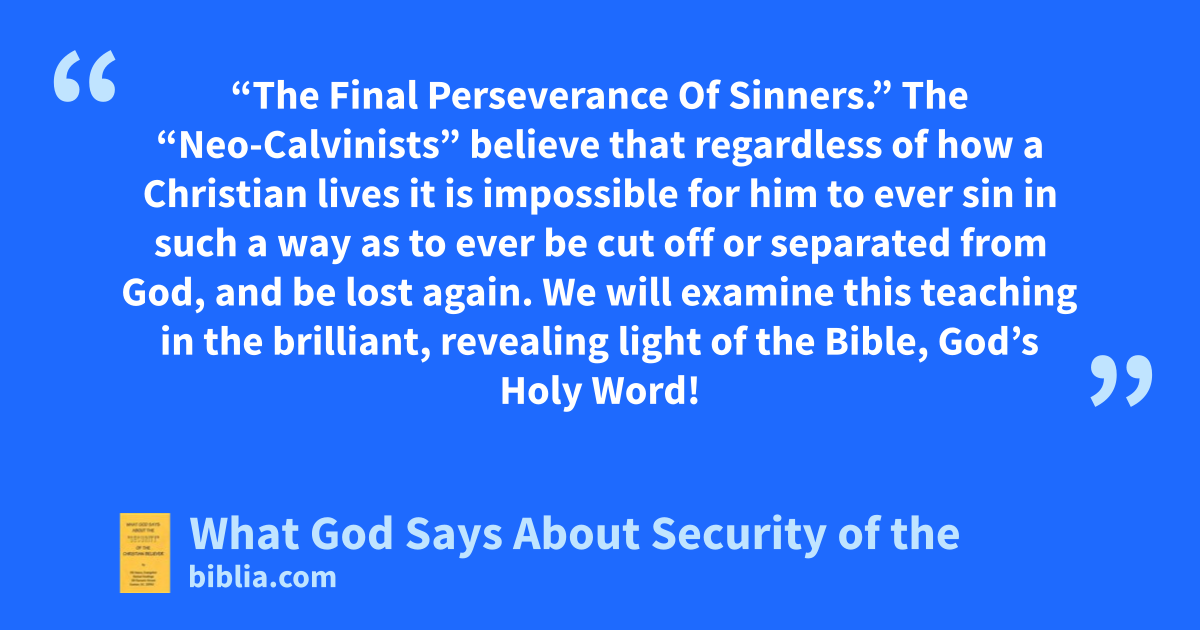 “The Final Perseverance Of Sinners.” The “Neo-Calvinists” believe that regardless of how a Christian lives it is impossible for him to ever sin in such a way as to ever be cut off or separated from God, and be lost again. We will examine this teaching in the brilliant, revealing light of the Bible, God’s Holy Word!
