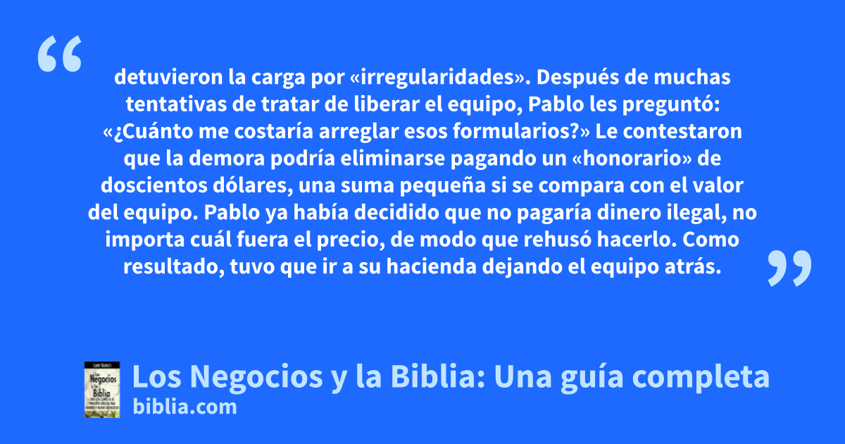 detuvieron la carga por «irregularidades». Después de muchas tentativas de tratar de liberar el equipo, Pablo les preguntó: «¿Cuánto me costaría arreglar esos formularios?» Le contestaron que la demora podría eliminarse pagando un «honorario» de doscientos dólares, una suma pequeña si se compara con el valor del equipo. Pablo ya había decidido que no pagaría dinero ilegal, no importa cuál fuera el precio, de modo que rehusó hacerlo. Como resultado, tuvo que ir a su hacienda dejando el equipo atrás.
