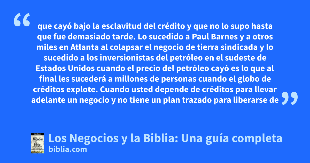 que cayó bajo la esclavitud del crédito y que no lo supo hasta que fue demasiado tarde. Lo sucedido a Paul Barnes y a otros miles en Atlanta al colapsar el negocio de tierra sindicada y lo sucedido a los inversionistas del petróleo en el sudeste de Estados Unidos cuando el precio del petróleo cayó es lo que al final les sucederá a millones de personas cuando el globo de créditos explote. Cuando usted depende de créditos para llevar adelante un negocio y no tiene un plan trazado para liberarse de