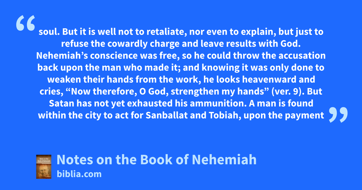 soul. But it is well not to retaliate, nor even to explain, but just to refuse the cowardly charge and leave results with God. Nehemiah’s conscience was free, so he could throw the accusation back upon the man who made it; and knowing it was only done to weaken their hands from the work, he looks heavenward and cries, “Now therefore, O God, strengthen my hands” (ver. 9). But Satan has not yet exhausted his ammunition. A man is found within the city to act for Sanballat and Tobiah, upon the payment