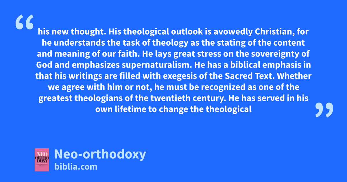 his new thought. His theological outlook is avowedly Christian, for he understands the task of theology as the stating of the content and meaning of our faith. He lays great stress on the sovereignty of God and emphasizes supernaturalism. He has a biblical emphasis in that his writings are filled with exegesis of the Sacred Text. Whether we agree with him or not, he must be recognized as one of the greatest theologians of the twentieth century. He has served in his own lifetime to change the theological