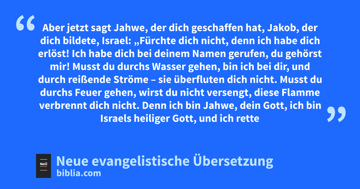 43 1 Aber jetzt sagt Jahwe, * der dich geschaffen hat, Jakob, * der dich bildete, Israel: * „Fürchte dich nicht, * denn ich habe dich erlöst! * Ich habe dich bei deinem Namen gerufen, * du gehörst mir! 2 Musst du durchs Wasser gehen, bin ich bei dir, * und durch reißende Ströme – sie überfluten dich nicht. * Musst du durchs Feuer gehen, * wirst du nicht versengt, * diese Flamme verbrennt dich nicht. 3 Denn ich bin Jahwe, dein Gott, * ich bin Israels heiliger Gott, * und ich rette dich! * Ägypten gebe ich als Lösegeld für dich, * Nubien und Seba1 noch dazu. 4 Weil du mir wert und teuer bist, * weil ich dich liebe, gebe ich Menschen an deiner Stelle hin, * ganze Völker für dein Leben. 5 Fürchte dich nicht, denn ich bin bei dir! * Von dort, wo die Sonne aufgeht, * hole ich deine Nachkommen zurück, * und von dort, wo sie untergeht, * sammle ich euch wieder ein. 6 Zum Norden sage ich: ‚Gib sie heraus!‘ * und zum Süden: ‚Halte sie nicht zurück!‘ * Lass kommen meine Söhne von fern * und meine Töchter vom Ende der Welt, 7 jeden, der mein Eigentum ist, * den ich zu meiner Ehre erschuf, * den ich formte und machte!“