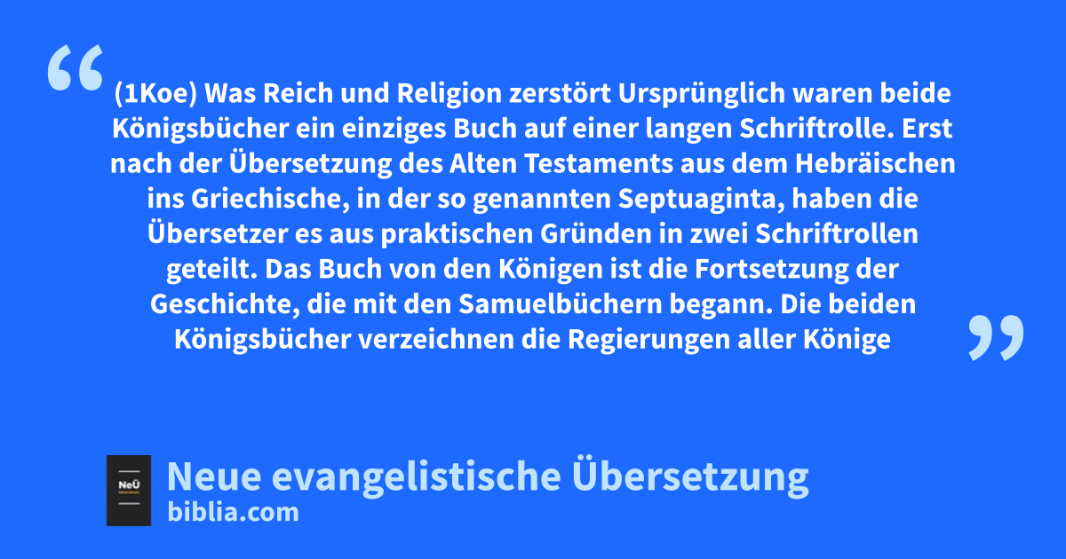 Ursprünglich waren beide Königsbücher ein einziges Buch auf einer langen Schriftrolle. Erst nach der Übersetzung des Alten Testaments aus dem Hebräischen ins Griechische, in der so genannten Septuaginta, haben die Übersetzer es aus praktischen Gründen in zwei Schriftrollen geteilt. Das Buch von den Königen ist die Fortsetzung der Geschichte, die mit den Samuelbüchern begann. Die beiden Königsbücher verzeichnen die Regierungen aller Könige von Israel und Juda, außer der von Saul. Sie zeigen die drei großen Perioden der Königsgeschichte: das vereinte Königreich, das in Juda und Israel aufgeteilte Reich und das übrig gebliebene Reich Juda bis zur Deportation in die Gefangenschaft nach Babylon. Die Königsbücher sind zwischen den Jahren 560 und 537 v.Chr. vollendet worden, wahrscheinlich schon kurz nach 560. Die Befreiung aus der Babylonischen Gefangenschaft 538 v.Chr. wird jedenfalls nicht mehr erwähnt. Ihr inspirierter Verfasser lebte wahrscheinlich im Exil in Babylonien. Sein Name wird uns aber nicht genannt. Er arbeitete viele Quellen ein, wie sie zum Beispiel in 1. Könige 11,41 und 14,19 erwähnt werden.