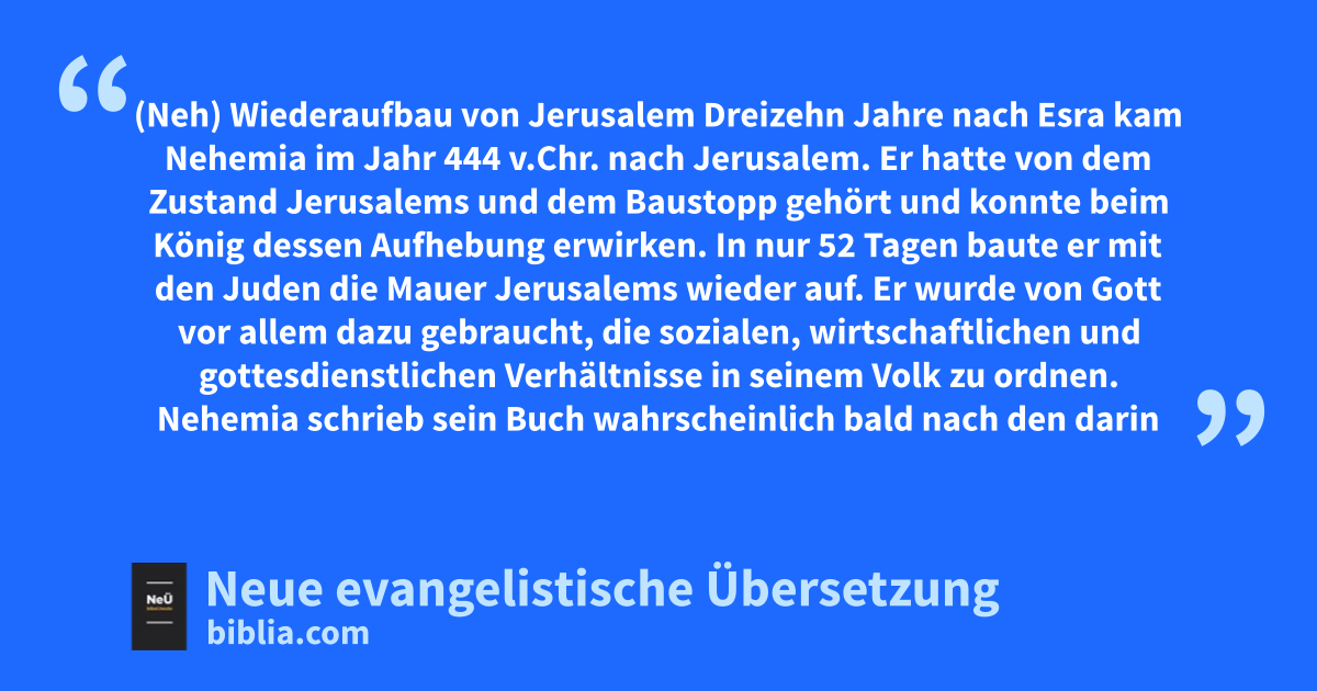 Dreizehn Jahre nach Esra kam Nehemia im Jahr 444 v.Chr. nach Jerusalem. Er hatte von dem Zustand Jerusalems und dem Baustopp gehört und konnte beim König dessen Aufhebung erwirken. In nur 52 Tagen baute er mit den Juden die Mauer Jerusalems wieder auf. Er wurde von Gott vor allem dazu gebraucht, die sozialen, wirtschaftlichen und gottesdienstlichen Verhältnisse in seinem Volk zu ordnen. Nehemia schrieb sein Buch wahrscheinlich bald nach den darin geschilderten Ereignissen auf, vermutlich kurz nach dem Jahr 430 v.Chr. Dabei arbeitete er auch offizielle Listen ein. Meist schrieb er in der Ich-Form, also 1. Person Einzahl. Texte in 3. Person könnte auch Esra eingefügt haben. Den Schluss bilden die Aufzeichnungen Nehemias aus seinem zweiten Aufenthalt in Jerusalem, der um 430 v.Chr. begann.