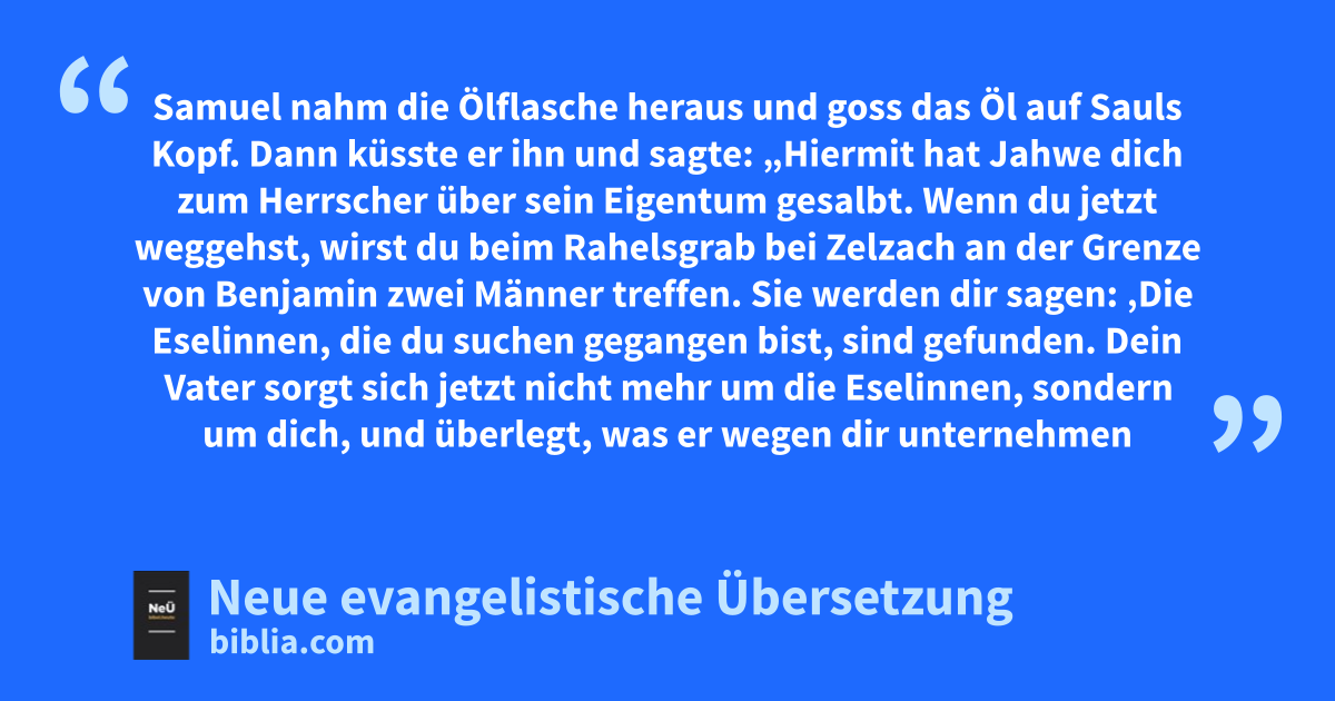 10 1 Samuel nahm die Ölflasche heraus und goss das Öl auf Sauls Kopf. Dann küsste er ihn und sagte: „Hiermit hat Jahwe dich zum Herrscher über sein Eigentum gesalbt. 2 Wenn du jetzt weggehst, wirst du beim Rahelsgrab bei Zelzach an der Grenze von Benjamin zwei Männer treffen. Sie werden dir sagen: ‚Die Eselinnen, die du suchen gegangen bist, sind gefunden. Dein Vater sorgt sich jetzt nicht mehr um die Eselinnen, sondern um dich, und überlegt, was er wegen dir unternehmen soll.‘ 3 Wenn du weitergehst, wirst du zur Terebinthe1 von Tabor2 kommen. Dort werden dir drei Männer begegnen, die zu Gott nach Bet-El hinaufgehen. Einer trägt drei Böckchen, einer drei Brote und der dritte einen Schlauch mit Wein. 4 Sie werden dich nach deinem Wohlergehen fragen und dir zwei Brote geben. Die sollst du von ihnen annehmen. 5 Danach wirst du zum Hügel Gottes kommen, wo Wachposten der Philister stehen. Gleich am Stadtrand begegnest du einer Gruppe Propheten, die von der Opferhöhe herabkommen. Vor ihnen her werden Harfe, Tamburin, Flöte und Zither gespielt, und sie weissagen* . 6 Dann wird der Geist Jahwes über dich kommen und du wirst mit ihnen weissagen. Von da an wirst du ein ganz anderer Mensch sein. 7 Wenn diese Zeichen bei dir eintreffen, dann tu einfach, was dir vor die Hände kommt, denn Gott ist bei dir! –8 Und wenn du einmal vor mir nach Gilgal gehst, sollst du sieben Tage auf mich warten. Ich werde zu dir hinabkommen, um Brandopfer darzubringen und Freudenopfer4 zu schlachten. Dann werde ich dich wissen lassen, was du tun sollst.“