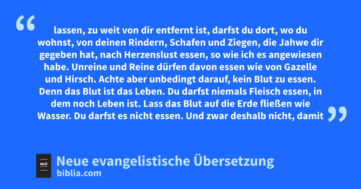 20 Wenn Jahwe, dein Gott, dein Gebiet erweitern wird, wie er es dir versprochen hat, und du gern Fleisch essen möchtest, dann kannst du das nach Herzenslust tun. 21 Wenn der Ort, den Jahwe auswählen wird, um seinen Namen dort wohnen zu lassen, zu weit von dir entfernt ist, darfst du dort, wo du wohnst, von deinen Rindern, Schafen und Ziegen, die Jahwe dir gegeben hat, nach Herzenslust essen, so wie ich es angewiesen habe. 22 Unreine und Reine dürfen davon essen wie von Gazelle und Hirsch. 23 Achte aber unbedingt darauf, kein Blut zu essen. Denn das Blut ist das Leben. Du darfst niemals Fleisch essen, in dem noch Leben ist. 24 Lass das Blut auf die Erde fließen wie Wasser. Du darfst es nicht essen. 25 Und zwar deshalb nicht, damit es dir und deinen Nachkommen gut geht, weil du tust, was vor Jahwe richtig ist.