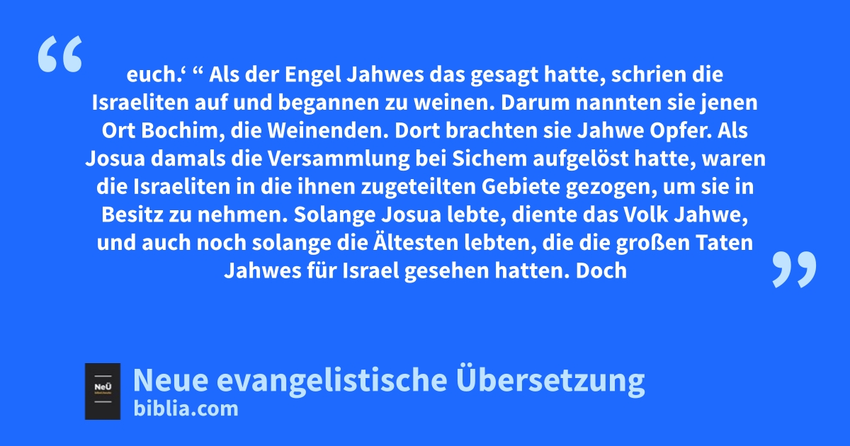 2 1 Der Engel Jahwes1 kam von Gilgal2 nach Bochim* herauf und sagte zu den Israeliten: „Ich habe euch aus Ägypten herausgeführt und euch in das Land gebracht, das ich euren Vätern unter Eid zugesichert hatte. Ich hatte gesagt: ‚Niemals werde ich meinen Bund mit euch brechen, nie! 2 Aber ihr dürft keinen Bund mit den Bewohnern dieses Landes schließen und müsst ihre Altäre niederreißen.‘ Doch ihr habt mir nicht gehorcht. Wie konntet ihr das nur tun? 3 So muss ich euch jetzt sagen: ‚Ich werde die Bewohner dieses Landes nicht vor euch vertreiben! Sie werden euch Widerstand leisten und ihre Götter werden zur Falle für euch.‘ “ 4 Als der Engel Jahwes das gesagt hatte, schrien die Israeliten auf und begannen zu weinen. 5 Darum nannten sie jenen Ort Bochim, die Weinenden. Dort brachten sie Jahwe Opfer.