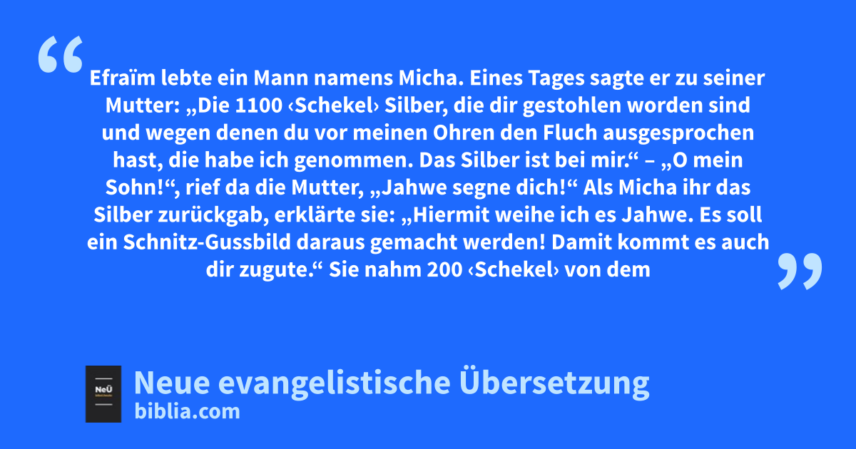17 1 Im Gebirge Efraïm lebte ein Mann namens Micha. 2 Eines Tages sagte er zu seiner Mutter: „Die 1100 ‹Schekel› Silber, die dir gestohlen worden sind und wegen denen du vor meinen Ohren den Fluch ausgesprochen hast, die habe ich genommen. Das Silber ist bei mir.“ – „O mein Sohn!“, rief da die Mutter, „Jahwe segne dich!“ 3 Als Micha ihr das Silber zurückgab, erklärte sie: „Hiermit weihe ich es Jahwe. Es soll ein Schnitz-Gussbild daraus gemacht werden! Damit kommt es auch dir zugute.“ 4 Sie nahm 200 ‹Schekel› von dem Silber und ließ vom Feinschmied ein solches Gussbild1 daraus machen. Micha stellte die Figur bei sich auf. 5 So kam Micha zu einem eigenen Heiligtum. Er ließ auch ein Efod und einige Terafim2 anfertigen und setzte dann einen von seinen Söhnen als Priester ein.
