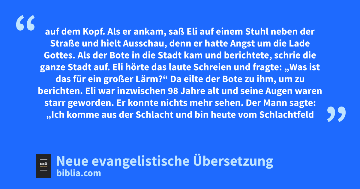 12 Ein Mann aus dem Stamm Benjamin lief vom Kampfgeschehen weg und kam noch am selben Tag nach Schilo. Seine Kleidung war zerrissen und er hatte Erde auf dem Kopf.6 13 Als er ankam, saß Eli auf einem Stuhl neben der Straße und hielt Ausschau, denn er hatte Angst um die Lade Gottes. Als der Bote in die Stadt kam und berichtete, schrie die ganze Stadt auf. 14 Eli hörte das laute Schreien und fragte: „Was ist das für ein großer Lärm?“ Da eilte der Bote zu ihm, um zu berichten. 15 Eli war inzwischen 98 Jahre alt und seine Augen waren starr geworden. Er konnte nichts mehr sehen. 16 Der Mann sagte: „Ich komme aus der Schlacht und bin heute vom Schlachtfeld geflohen.“ – „Wie ist es ausgegangen, mein Sohn?“, fragte Eli. 17 „Israel ist vor den Philistern geflohen“, erwiderte der Bote. „Es hat eine große Niederlage gegeben. Deine beiden Söhne Hofni und Pinhas sind tot. Die Lade Gottes ist erbeutet worden.“ 18 Als er die Lade Gottes erwähnte, fiel Eli rückwärts von seinem Stuhl an der Seite des Tores. Dabei brach er sich das Genick und starb, denn er war ein alter und schwerer Mann. 40 Jahre lang war er Israels Richter gewesen.