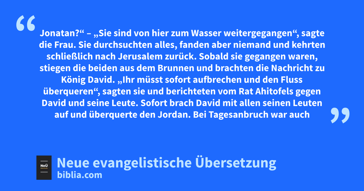15 Huschai berichtete den Priestern Zadok und Abjatar vom Rat Ahitofels und dem, den er selbst Abschalom und den Ältesten Israels gegeben hatte. 16 „Schickt schnell eine Botschaft zu David“, sagte er. „Er soll ja nicht auf dieser Seite der Wüstenfurten bleiben, sondern in jedem Fall hinübergehen, damit der König und seine Leute nicht vernichtet werden.“ 17 Jonatan und Ahimaaz warteten bei der Rogelquelle* , denn sie durften sich nicht in der Stadt sehen lassen. Eine Magd ging zu ihnen und brachte die Nachricht, die sie dem König übermitteln sollten. 18 Doch ein junger Mann sah sie und berichtete es Abschalom. Da rannten beide fort und kamen bis zum Haus eines Mannes in Bahurim. Er hatte einen Brunnen in seinem Hof, in den sie hineinstiegen. 19 Seine Frau legte eine Decke über die Öffnung und streute Getreidekörner darüber aus, sodass nichts zu erkennen war. 20 Als die Männer Abschaloms zu der Frau kamen, fragten sie: „Wo sind Ahimaaz und Jonatan?“ – „Sie sind von hier zum Wasser weitergegangen“, sagte die Frau. Sie durchsuchten alles, fanden aber niemand und kehrten schließlich nach Jerusalem zurück. 21 Sobald sie gegangen waren, stiegen die beiden aus dem Brunnen und brachten die Nachricht zu König David. „Ihr müsst sofort aufbrechen und den Fluss überqueren“, sagten sie und berichteten vom Rat Ahitofels gegen David und seine Leute. 22 Sofort brach David mit allen seinen Leuten auf und überquerte den Jordan. Bei Tagesanbruch war auch der Letzte von ihnen am anderen Ufer angelangt.