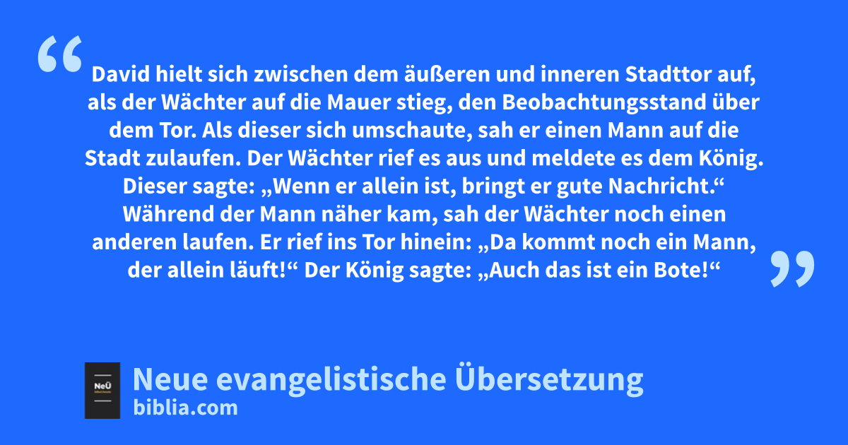 24 David hielt sich zwischen dem äußeren und inneren Stadttor auf, als der Wächter auf die Mauer stieg, den Beobachtungsstand über dem Tor. Als dieser sich umschaute, sah er einen Mann auf die Stadt zulaufen. 25 Der Wächter rief es aus und meldete es dem König. Dieser sagte: „Wenn er allein ist, bringt er gute Nachricht.“ Während der Mann näher kam, 26 sah der Wächter noch einen anderen laufen. Er rief ins Tor hinein: „Da kommt noch ein Mann, der allein läuft!“ Der König sagte: „Auch das ist ein Bote!“ 27 Da sagte der Wächter: „So, wie ich sehe, läuft der erste wie Ahimaaz Ben-Zadok.“ Der König sagte: „Das ist ein guter Mann. Er kommt gewiss mit einer guten Nachricht!“ 28 Ahimaaz rief: „Schalom!“, und warf sich vor dem König nieder, mit dem Gesicht zum Erdboden. „Gepriesen sei Jahwe, dein Gott!“, stieß er hervor. „Er hat alle ausgeliefert, die sich gegen meinen Herrn und König erhoben haben.“ 29 „Und was ist mit meinem Jungen, mit Abschalom?“, fragte der König. „Er ist doch hoffentlich unversehrt!“ Ahimaaz erwiderte: „Ich sah das große Gedränge, als Joab den Diener des Königs und mich, deinen Diener, fortschickte. Aber ich konnte nicht erkennen, was es war.“ 30 „Stell dich hier neben mich“, sagte der König zu ihm. 31 Da kam auch schon der Nubier und rief: „Mein König und Herr lasse sich die gute Nachricht bringen: Jahwe hat dir heute Recht verschafft! Er hat dich aus der Gewalt aller befreit, die sich gegen dich erhoben haben.“ 32 „Ist mein Junge, ist Abschalom unversehrt?“, fragte der König den Nubier. Dieser erwiderte: „Möge es den Feinden meines Herrn und Königs und allen, die sich böswillig gegen dich erhoben haben, so ergehen wie dem Jungen!“