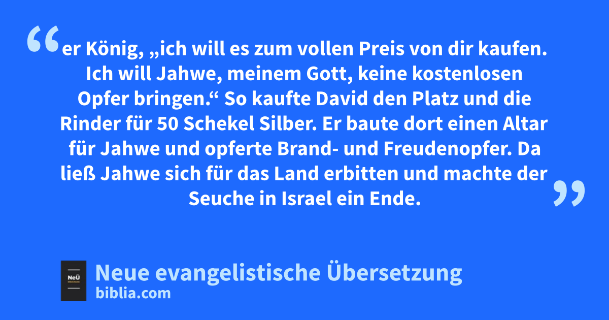 18 An diesem Tag kam Gad zu David und sagte zu ihm: „Geh hinauf zum Dreschplatz des Jebusiters Arauna und errichte dort einen Altar für Jahwe!“ 19 Da zog David nach dem Befehl Jahwes, der durch Gad zu ihm gekommen war, hinauf. 20 Als Arauna hinausblickte und den König mit seinem Gefolge zu sich kommen sah, ging er hinaus und verneigte sich tief gebeugt vor ihm. 21 Er fragte: „Weshalb kommt mein Herr und König zu seinem Diener?“ – „Um den Dreschplatz von dir zu kaufen“, sagte David. „Ich will Jahwe einen Altar bauen, damit die Seuche vom Volk abgewehrt wird.“ 22 Da sagte Arauna zu David: „Mein Herr und König nehme und opfere, was er will. Hier sind die Rinder zum Brandopfer. Die Dreschschlitten und die Rindergeschirre können das Brennholz sein. 23 Ich schenke dir das alles, mein König“, sagte Arauna und fügte hinzu: „Möge Jahwe, dein Gott, dich gnädig annehmen!“ 24 „Nein“, sagte der König, „ich will es zum vollen Preis von dir kaufen. Ich will Jahwe, meinem Gott, keine kostenlosen Opfer bringen.“ So kaufte David den Platz und die Rinder für 50 Schekel Silber. 25 Er baute dort einen Altar für Jahwe und opferte Brand- und Freudenopfer8. Da ließ Jahwe sich für das Land erbitten und machte der Seuche in Israel ein Ende.