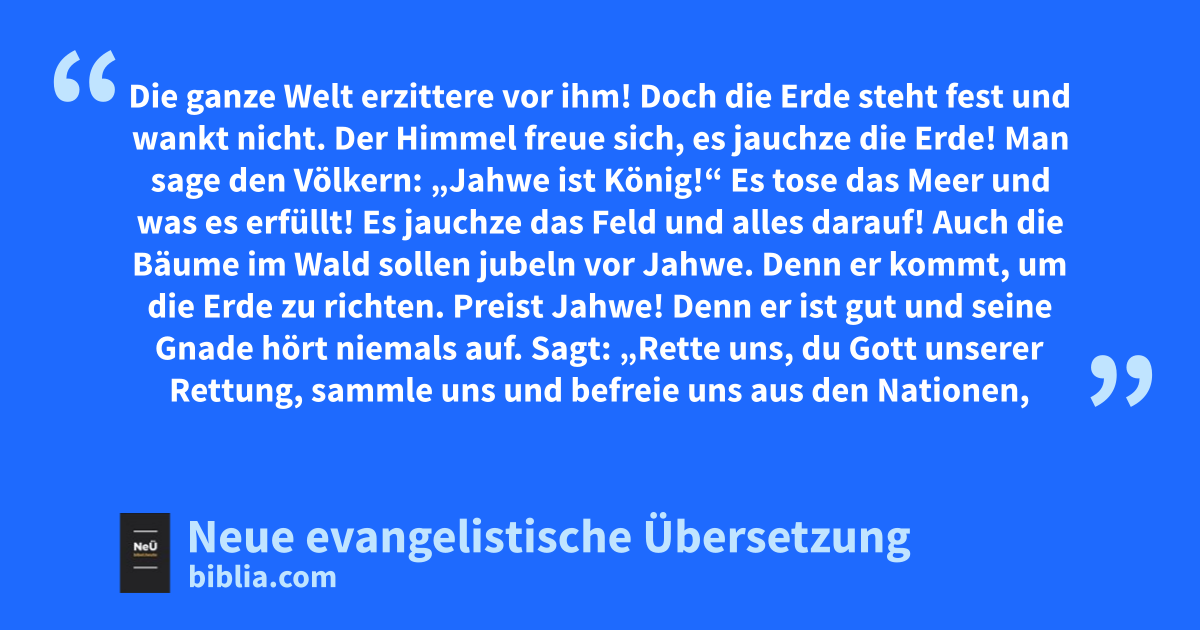 30 Die ganze Welt erzittere vor ihm! * Doch die Erde steht fest und wankt nicht. 31 Der Himmel freue sich, es jauchze die Erde! * Man sage den Völkern: „Jahwe ist König!“ 32 Es tose das Meer und was es erfüllt! * Es jauchze das Feld und alles darauf! 33 Auch die Bäume im Wald sollen jubeln vor Jahwe. * Denn er kommt, um die Erde zu richten.