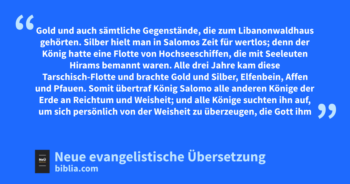 22 Somit übertraf König Salomo alle anderen Könige der Erde an Reichtum und Weisheit; 23 und alle Könige suchten ihn auf, um sich persönlich von der Weisheit zu überzeugen, die Gott ihm verliehen hatte. 24 Alle brachten ihm Geschenke mit: silberne und goldene Gegenstände, Festgewänder und Waffen, kostbare Öle, Pferde und Maultiere. So ging es Jahr um Jahr.