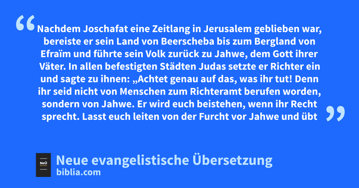 4 Nachdem Joschafat eine Zeitlang in Jerusalem geblieben war, bereiste er sein Land von Beerscheba bis zum Bergland von Efraïm und führte sein Volk zurück zu Jahwe, dem Gott ihrer Väter. 5 In allen befestigten Städten Judas setzte er Richter ein 6 und sagte zu ihnen: „Achtet genau auf das, was ihr tut! Denn ihr seid nicht von Menschen zum Richteramt berufen worden, sondern von Jahwe. Er wird euch beistehen, wenn ihr Recht sprecht. 7 Lasst euch leiten von der Furcht vor Jahwe und übt euer Amt gewissenhaft aus! Denn bei Jahwe, unserem Gott, gibt es keine Ungerechtigkeit, keine Bevorzugung und keine Bestechlichkeit.“