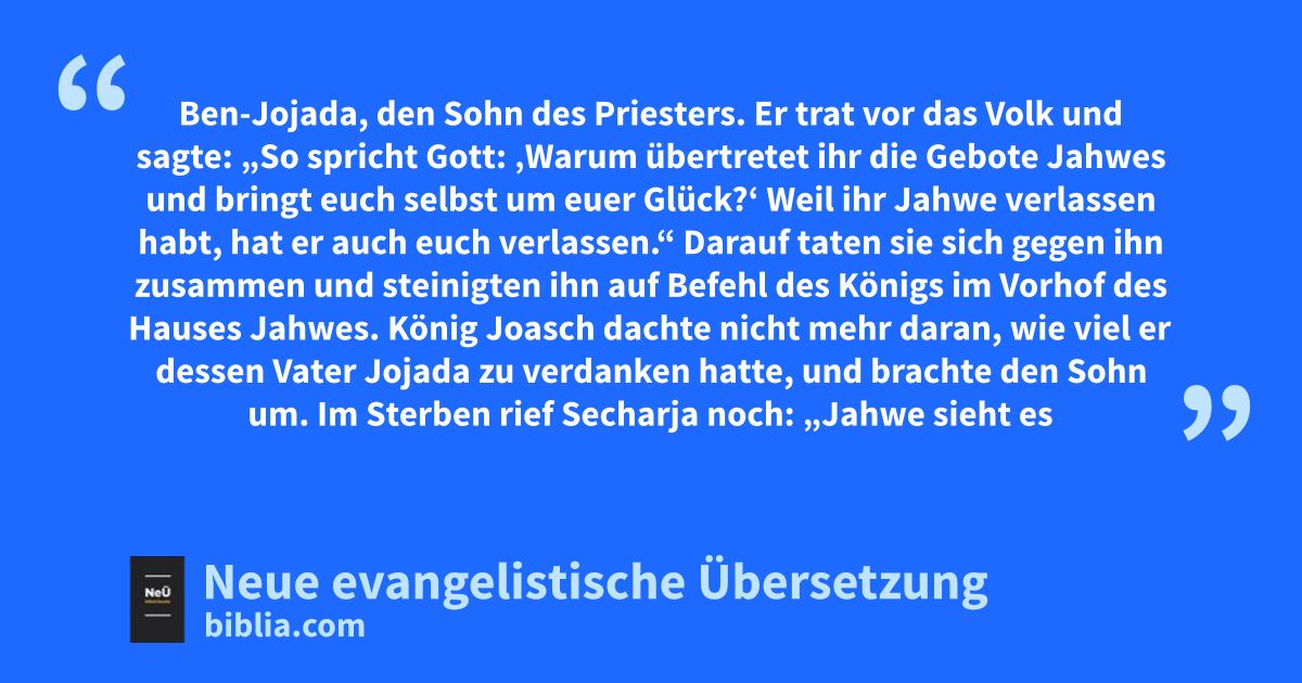 19 Jahwe schickte Propheten zu ihnen, um sein Volk zurückzugewinnen. Die Propheten warnten sie, aber niemand hörte darauf. 20 So kam der Geist Gottes über Secharja Ben-Jojada, den Sohn des Priesters. Er trat vor das Volk und sagte: „So spricht Gott: ‚Warum übertretet ihr die Gebote Jahwes und bringt euch selbst um euer Glück?‘ Weil ihr Jahwe verlassen habt, hat er auch euch verlassen.“ 21 Darauf taten sie sich gegen ihn zusammen und steinigten ihn auf Befehl des Königs im Vorhof des Hauses Jahwes. 22 König Joasch dachte nicht mehr daran, wie viel er dessen Vater Jojada zu verdanken hatte, und brachte den Sohn um. Im Sterben rief Secharja noch: „Jahwe sieht es und wird es vergelten!“