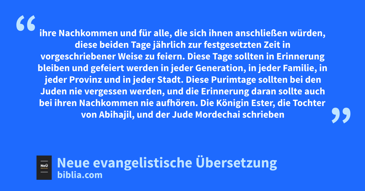 29 Die Königin Ester, die Tochter von Abihajil, und der Jude Mordechai schrieben nämlich noch einen zweiten Brief, in dem sie mit allem Nachdruck das Purimfest zur Pflicht machten. 30 Der Brief richtete sich mit Worten treuer und aufrichtiger Gesinnung an alle Juden in den 127 Provinzen des Xerxes. 31 Er legte das Datum der Purimtage fest, wie es der Jude Mordechai und die Königin Ester angeordnet und wie sie es für sich selbst und ihre Nachkommen zur Pflicht gemacht hatten. Das Schreiben enthielt auch die Vorschriften für das Fasten und Klagen, das dem Fest vorausgeht. 32 Der Befehl Esters machte diese Purimvorschriften zur Pflicht. Ihr Wortlaut wurde auf einer Urkunde festgehalten3.
