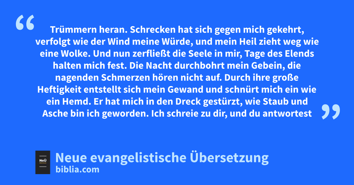 16 Und nun zerfließt die Seele in mir, * Tage des Elends halten mich fest. 17 Die Nacht durchbohrt mein Gebein, * die nagenden Schmerzen hören nicht auf. 18 Durch ihre große Heftigkeit * entstellt sich mein Gewand * und schnürt mich ein wie ein Hemd. 19 Er hat mich in den Dreck gestürzt, * wie Staub und Asche bin ich geworden. 20 Ich schreie zu dir, und du antwortest nicht; * ich stehe da, und du starrst mich nur an. 21 Zum Grausamen verwandelst du dich mir, * mit starker Hand verfolgst du mich. 22 Du hebst mich hoch, lässt mich reiten im Wind, * dass ich die Besinnung verlier. 23 Ich weiß, du führst mich in den Tod, * ins Haus, wo alles Lebendige gesammelt wird.