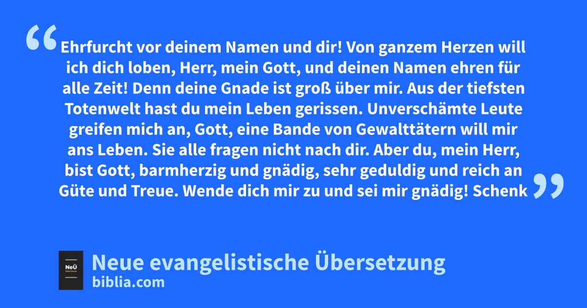 11 Lehre mich, Jahwe, deinen Weg: * Ich will ihn gehen in Treue zu dir! * Richte mein Herz auf das Eine: * zur Ehrfurcht vor deinem Namen und dir! 12 Von ganzem Herzen will ich dich loben, Herr, mein Gott, * und deinen Namen ehren für alle Zeit! 13 Denn deine Gnade ist groß über mir. * Aus der tiefsten Totenwelt hast du mein Leben gerissen. 14 Unverschämte Leute greifen mich an, Gott, * eine Bande von Gewalttätern will mir ans Leben. * Sie alle fragen nicht nach dir.