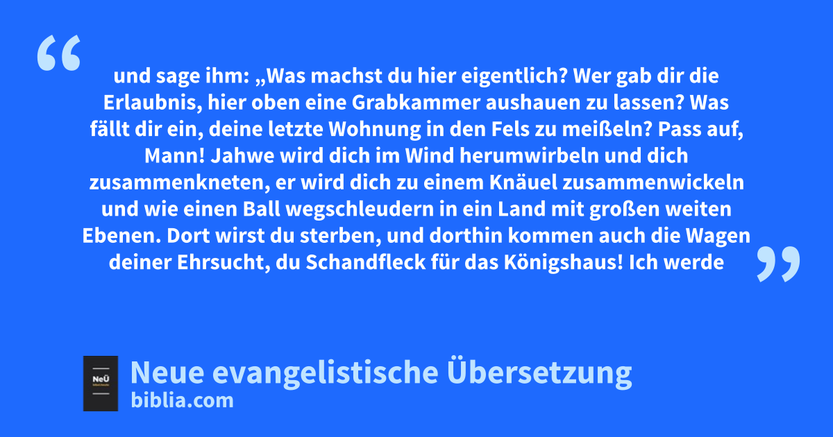 15 So sprach Jahwe, der Herr aller Heere: Geh zu diesem Verwalter da, zu Schebna, dem Palastvorsteher, und sage ihm: 16 „Was machst du hier eigentlich? Wer gab dir die Erlaubnis, hier oben eine Grabkammer aushauen zu lassen? Was fällt dir ein, deine letzte Wohnung in den Fels zu meißeln? 17 Pass auf, Mann! Jahwe wird dich im Wind herumwirbeln und dich zusammenkneten, 18 er wird dich zu einem Knäuel zusammenwickeln und wie einen Ball wegschleudern in ein Land mit großen weiten Ebenen. Dort wirst du sterben, und dorthin kommen auch die Wagen deiner Ehrsucht, du Schandfleck für das Königshaus! 19 Ich werde dich aus deinem Amt verjagen und dafür sorgen, dass man dich von deinem hohen Posten holt.