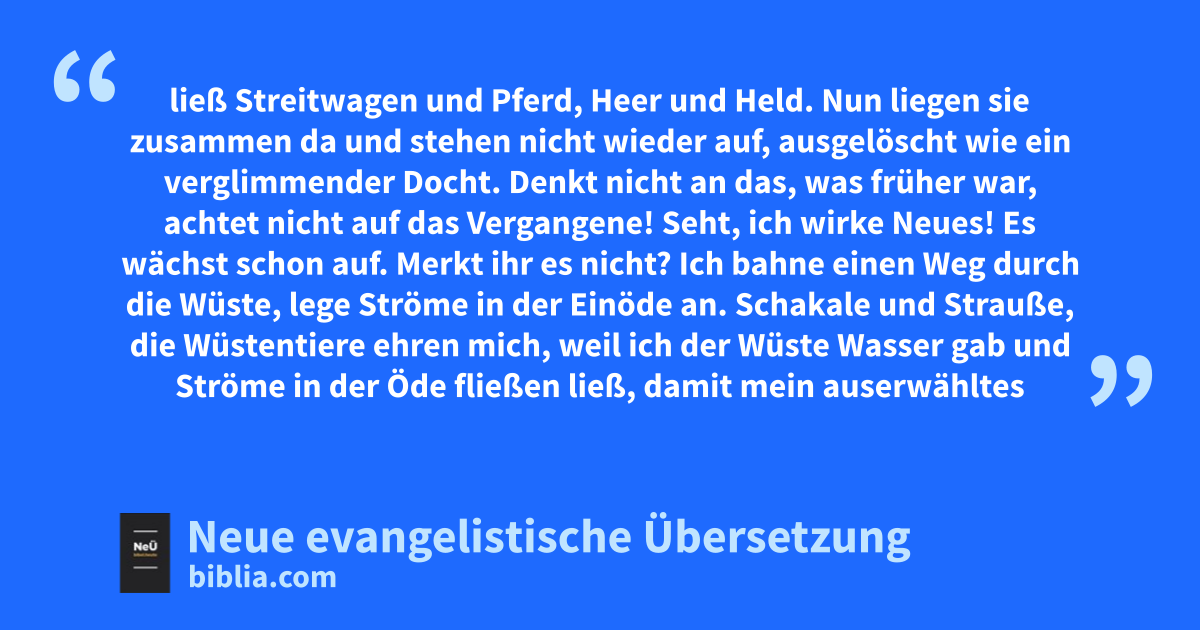 18 Denkt nicht an das, was früher war, * achtet nicht auf das Vergangene! 19 Seht, ich wirke Neues! * Es wächst schon auf. * Merkt ihr es nicht? * Ich bahne einen Weg durch die Wüste, * lege Ströme in der Einöde an. 20 Schakale und Strauße, die Wüstentiere ehren mich, * weil ich der Wüste Wasser gab * und Ströme in der Öde fließen ließ, * damit mein auserwähltes Volk zu trinken hat. 21 Dieses Volk, das ich mir schuf, * soll erzählen, was ich tat.