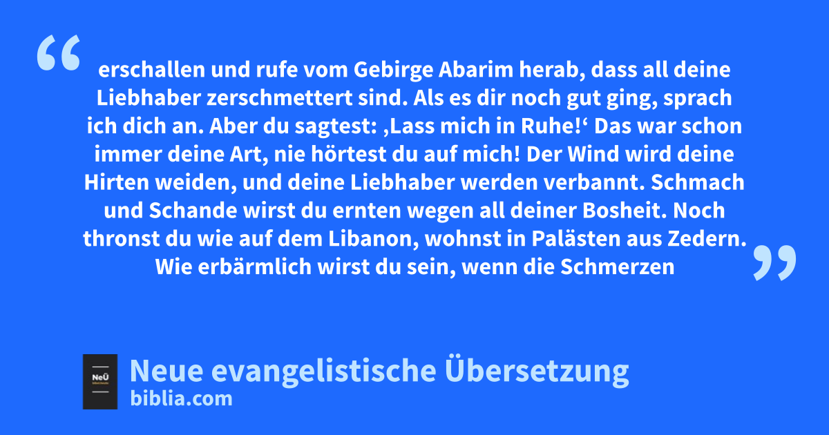 20 „Ersteig den Libanon und schreie! * Lass deine Stimme auf dem Baschan erschallen * und rufe vom Gebirge Abarim4 herab, * dass all deine Liebhaber zerschmettert sind. 21 Als es dir noch gut ging, sprach ich dich an. * Aber du sagtest: ‚Lass mich in Ruhe!‘ * Das war schon immer deine Art, * nie hörtest du auf mich! 22 Der Wind wird deine Hirten weiden, * und deine Liebhaber werden verbannt. * Schmach und Schande wirst du ernten * wegen all deiner Bosheit. 23 Noch thronst du wie auf dem Libanon, * wohnst in Palästen aus Zedern. * Wie erbärmlich wirst du sein, * wenn die Schmerzen über dich kommen * wie die Wehen über die Frau!“