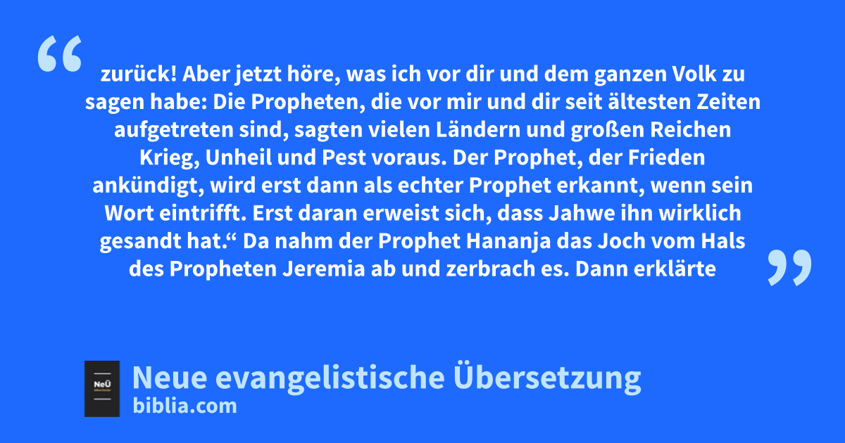 5 Da sagte der Prophet Jeremia öffentlich vor den Priestern und dem Volk, das sich im Haus Jahwes befand, zu dem Propheten Hananja: 6 „Amen! Ich wünschte, Jahwe würde das tun! Er lasse deine Worte in Erfüllung gehen und bringe die Gegenstände aus dem Haus Jahwes und alle nach Babylonien Verschleppten an diesen Ort zurück! 7 Aber jetzt höre, was ich vor dir und dem ganzen Volk zu sagen habe: 8 Die Propheten, die vor mir und dir seit ältesten Zeiten aufgetreten sind, sagten vielen Ländern und großen Reichen Krieg, Unheil und Pest voraus. 9 Der Prophet, der Frieden ankündigt, wird erst dann als echter Prophet erkannt, wenn sein Wort eintrifft. Erst daran erweist sich, dass Jahwe ihn wirklich gesandt hat.“