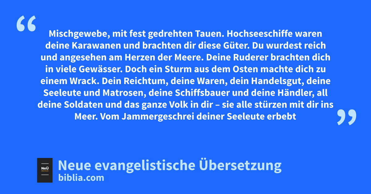 Doch ein Sturm aus dem Osten machte dich zu einem Wrack. 27 Dein Reichtum, deine Waren, dein Handelsgut, deine Seeleute und Matrosen, deine Schiffsbauer und deine Händler, all deine Soldaten und das ganze Volk in dir – sie alle stürzen mit dir ins Meer. 28 Vom Jammergeschrei deiner Seeleute erbebt das Land um dich herum. 29 Alle deine Ruderer, die Seeleute und Matrosen verlassen ihre Schiffe und bleiben an Land. 30 Sie schreien laut und klagen bitterlich, sie streuen Staub auf ihre Köpfe und wälzen sich in Asche, 31 sie scheren sich eine Glatze und ziehen den Trauersack an. Sie weinen um dich aus verbitterter Seele und halten die Totenklage über dich. 32 In ihrem Jammer stimmen sie ein Klagelied über dich an:
