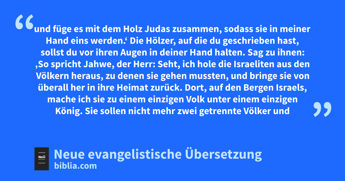 15 Das Wort Jahwes kam zu mir. Er sagte: 16 „Du Mensch, nimm dir ein Stück Holz und schreibe darauf: ‚Juda und die zu ihm gehörenden Leute von Israel‘! Nimm ein zweites Stück Holz und schreibe darauf: ‚Josef, Efraïm und das ganze Volk Israel, das zu ihm gehört‘! 17 Dann halte beide zusammen, dass sie in deiner Hand wie ein einziges Stück Holz aussehen. 18 Und wenn deine Landsleute dich fragen: ‚Willst du uns nicht erklären, was das bedeuten soll?‘, 19 dann sag zu ihnen: ‚So spricht Jahwe, der Herr: Seht, ich nehme das Holz Josefs, das für Efraïm und die Stämme Israels steht, die zu ihm gehören, und füge es mit dem Holz Judas zusammen, sodass sie in meiner Hand eins werden.‘ 20 Die Hölzer, auf die du geschrieben hast, sollst du vor ihren Augen in deiner Hand halten. 21 Sag zu ihnen: