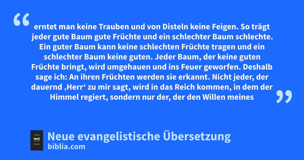 15 Hütet euch vor den falschen Propheten! Sie sehen aus wie sanfte Schafe, in Wirklichkeit aber sind sie reißende Wölfe. 16 An ihren Früchten werdet ihr sie erkennen. Von Dornen erntet man keine Trauben und von Disteln keine Feigen. 17 So trägt jeder gute Baum gute Früchte und ein schlechter Baum schlechte. 18 Ein guter Baum kann keine schlechten Früchte tragen und ein schlechter Baum keine guten. 19 Jeder Baum, der keine guten Früchte bringt, wird umgehauen und ins Feuer geworfen. 20 Deshalb sage ich: An ihren Früchten werden sie erkannt.